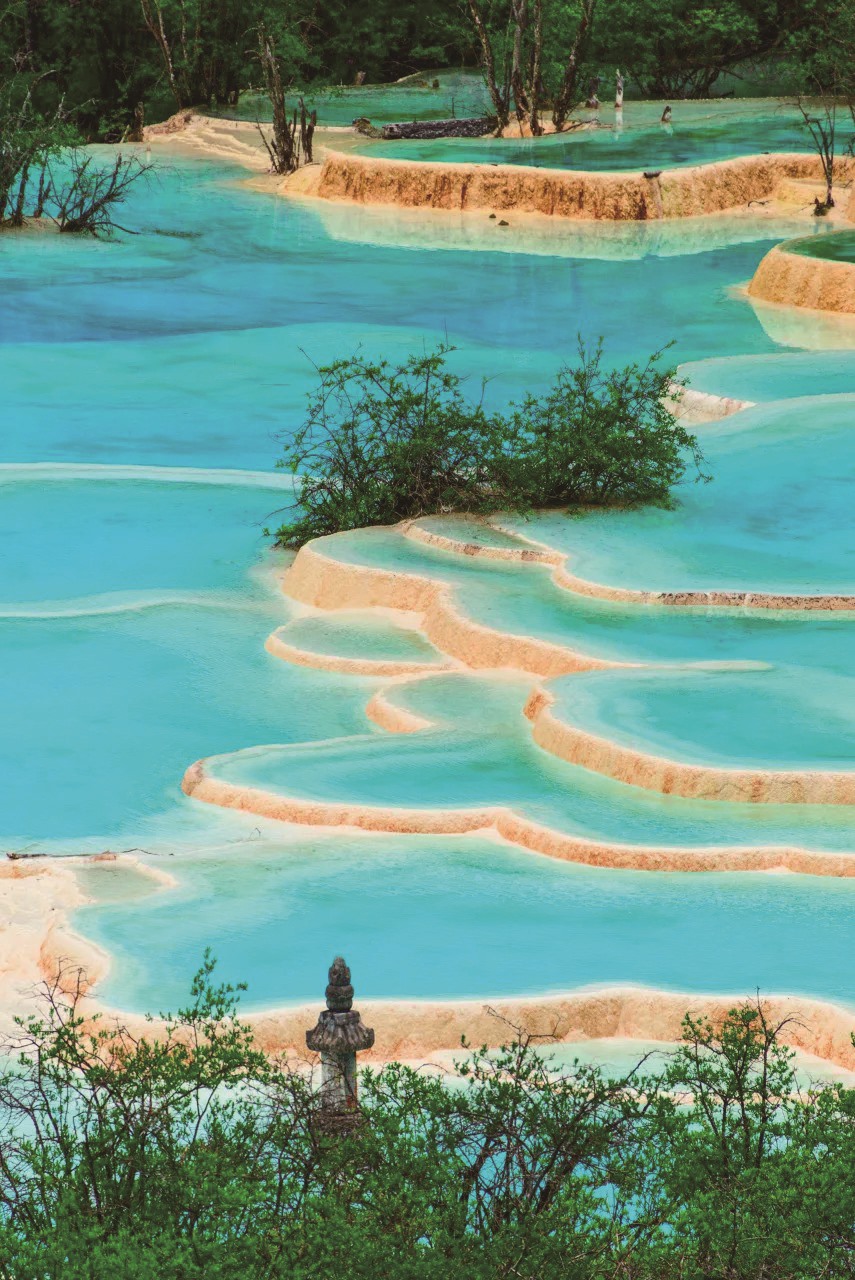 这里大大小小500多个彩池,每个池子像是装满五彩颜料的调色盘。因水中矿物质含量不同,池子会呈现出蓝绿、鹅黄、乳白各不相同的梦幻色彩。池水清澈见底,倒映着远处的雪山和近处的古木,虚实交错间,仿佛打开了另一个世界的门。