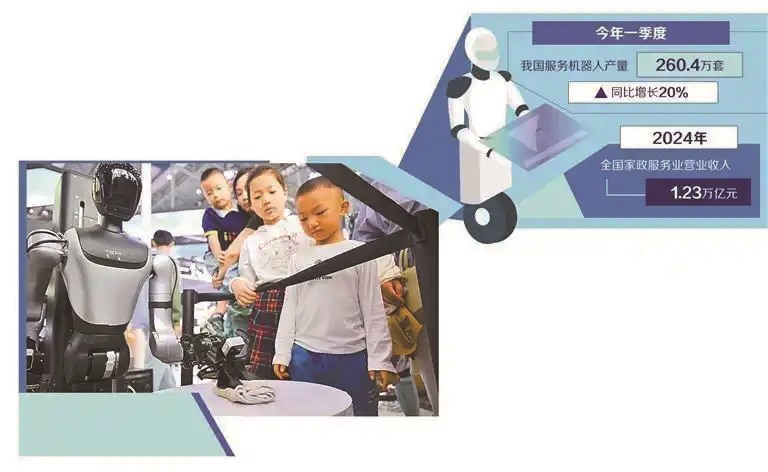 在政策、技术与市场需求多重因素驱动下,保姆机器人正开拓产业新蓝海。今年一季度,我国服务机器人产量达260.4万套,同比增长20%。“目前,人形机器人处于技术突破与商业化探索并行的关键阶段,一旦技术成熟并规模化商用,将对服务业带来变革性影响。”王志伟说。