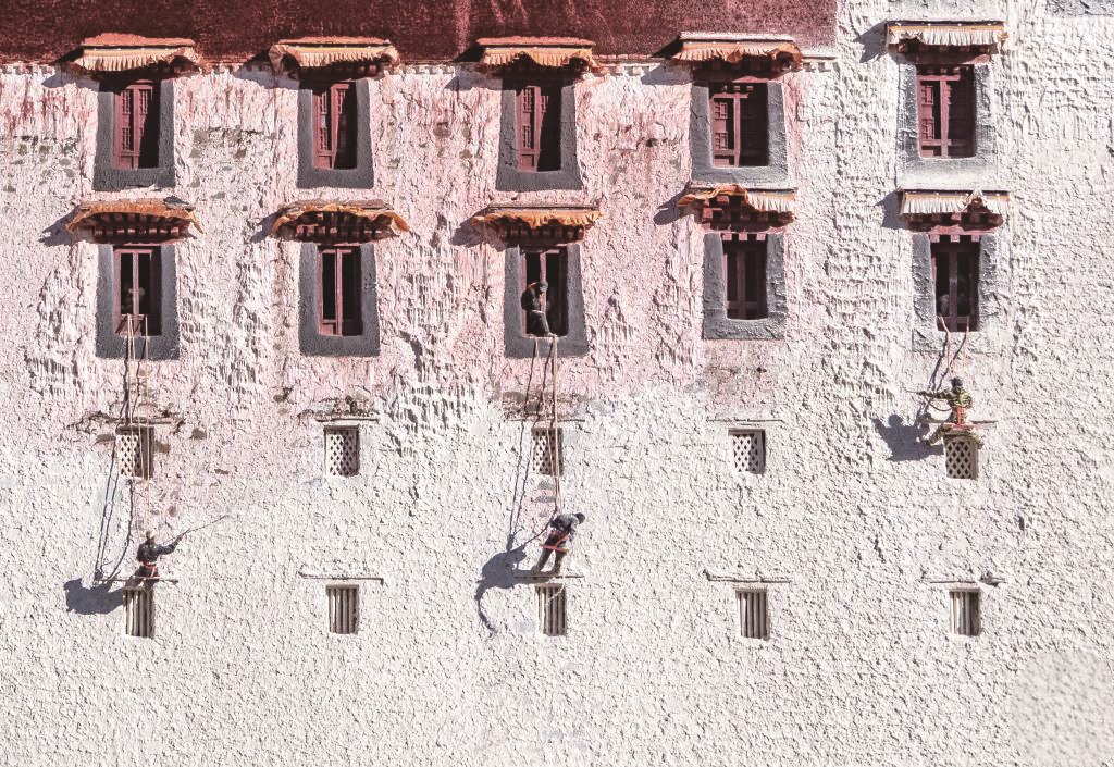 近日,西藏布达拉宫迎来一年一度的粉刷“美容”。工作人员和志愿者将粉刷材料按比例混合,经过滤后对布达拉宫墙体进行喷涂,让建筑更加美观。