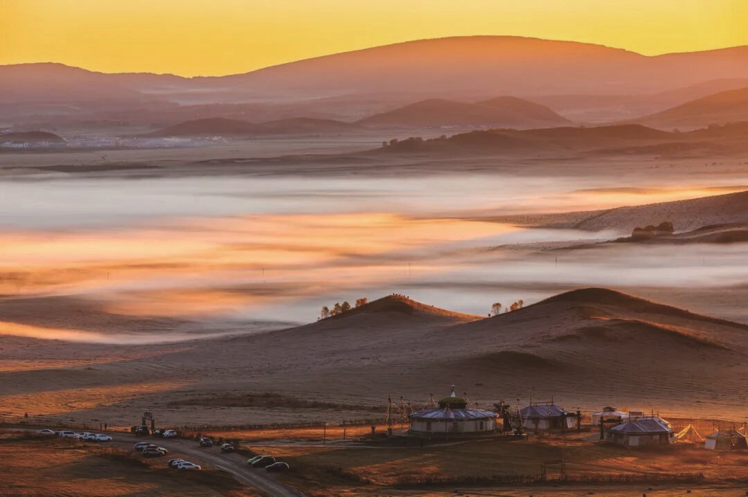 微风拂过,风车缓缓转动,与远处的山峦、近处的牛羊共同构成了一幅绝美的草原画卷。尤其是在日落时分,余晖洒在大地上,整个齐岳山被染成了金黄色,仿佛置身于梦幻之中。