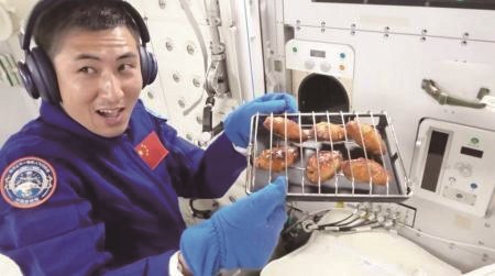 从空间站下行的视频资料看到,航天员从包装袋里取出腌制好的鸡翅,在签架上进行固定后放入热风烘烤机内,加热28分钟,一盘滋滋冒油的宇宙级奥尔良烤鸡翅就制作出来了。神二十航天员王杰和神二十一航天员武飞两个内蒙古人,还联手烤制了一盘热气腾腾的黑椒牛排,让神二十乘组指令长陈冬一饱口福。