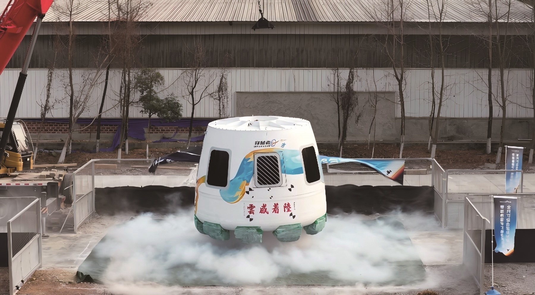 图为穿越者壹号载人飞船全尺寸试验舱着陆缓冲综合验证试验现场。