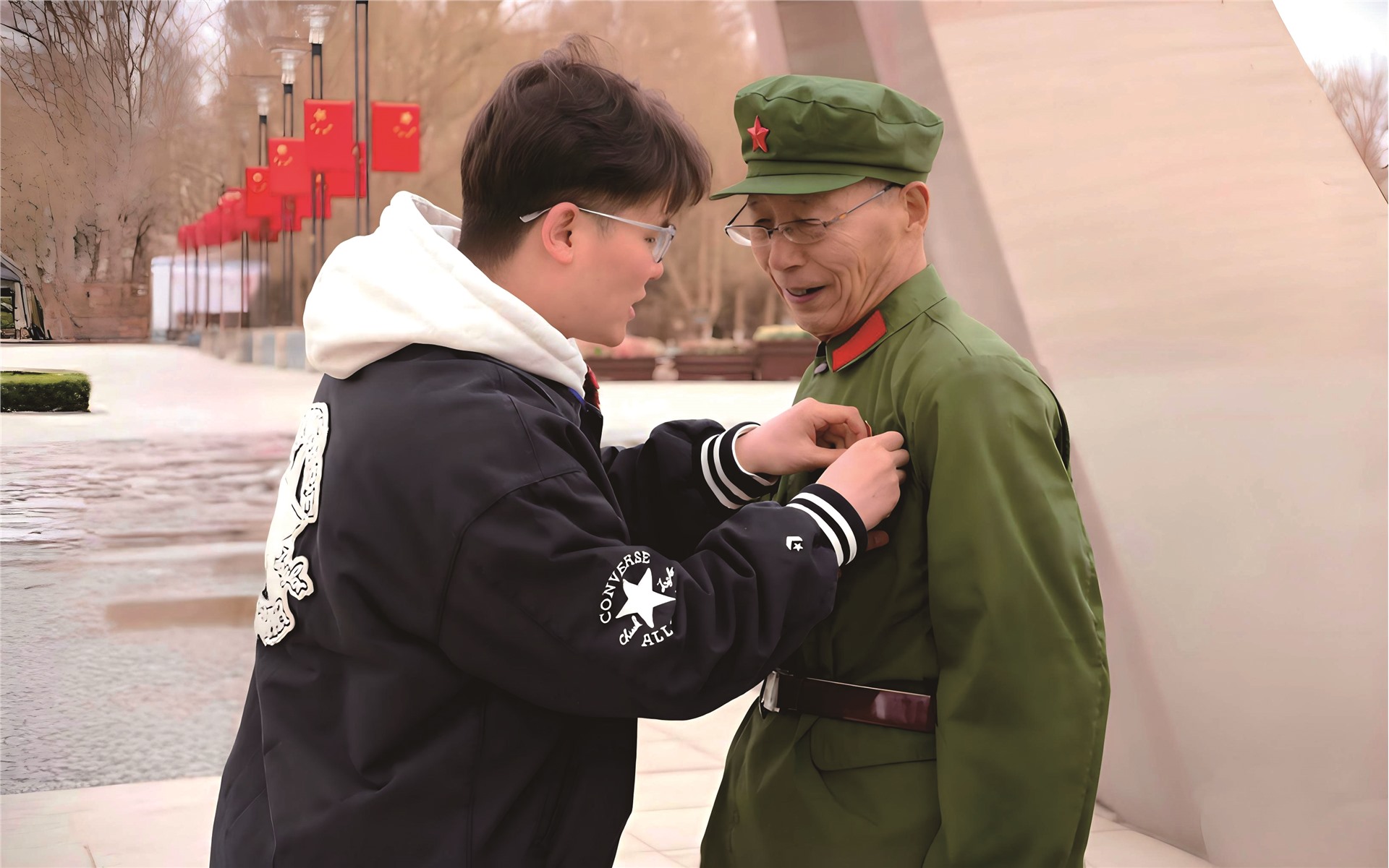 在青海省格尔木市的将军楼公园,曾在上世纪70年代参与修建青藏铁路的铁七师老战士李来所,郑重地将一枚崭新的党员徽章,递到西藏民族大学学生毛思斌的手中。阳光穿过雪域高原的稀薄空气,照亮了胸前金色的党员徽章,这位“90后”小伙的指尖触到徽章的那一刻,也接过了一份跨越半个多世纪关于青藏铁路的精神传承。