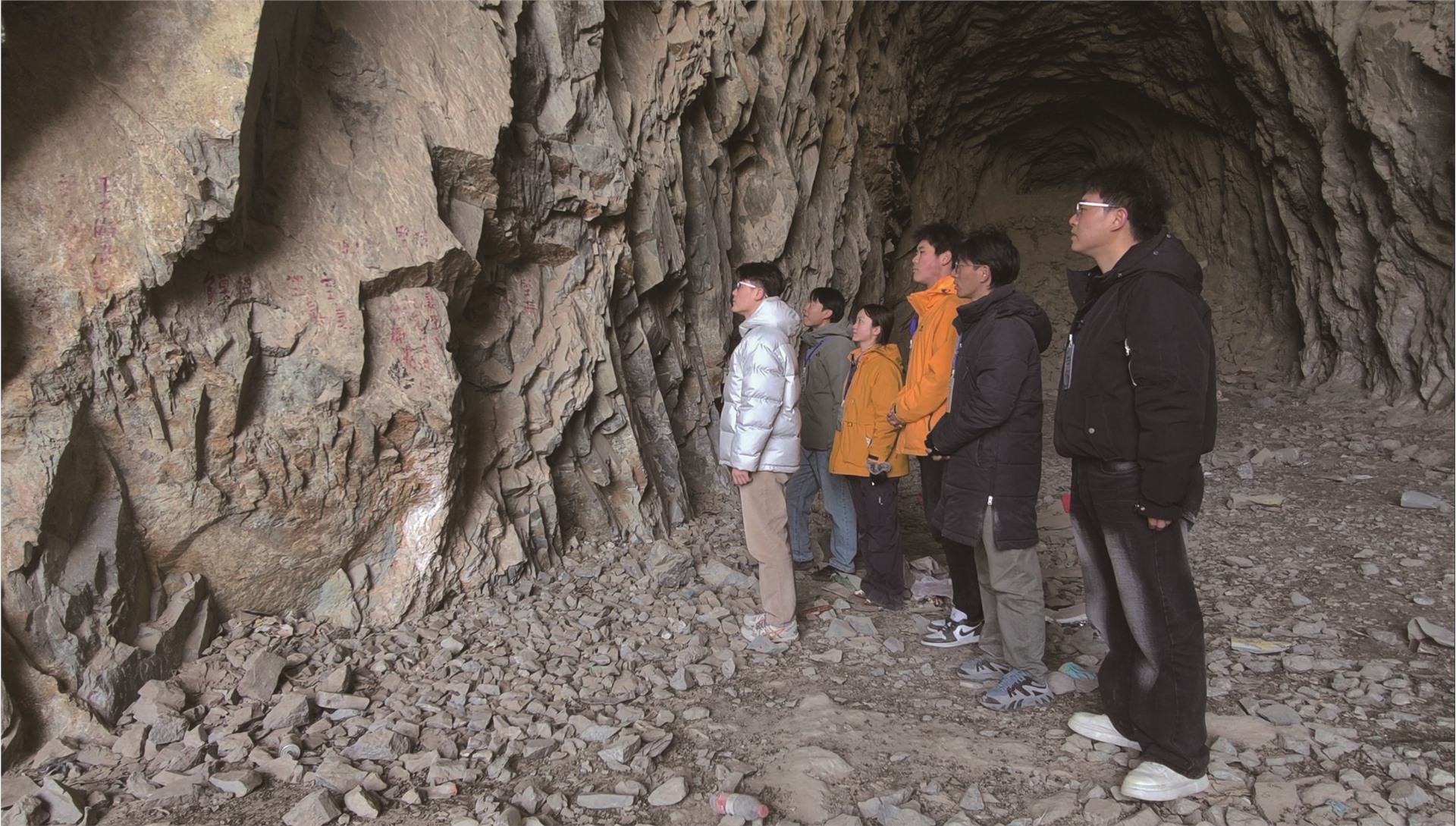 研学社成员在雪水河隧道瞻仰先辈留下的字迹。(左起依次为毛思斌、王天照、管瑞子、张添翼、闹布、郭江波)摄影:赵宇琪