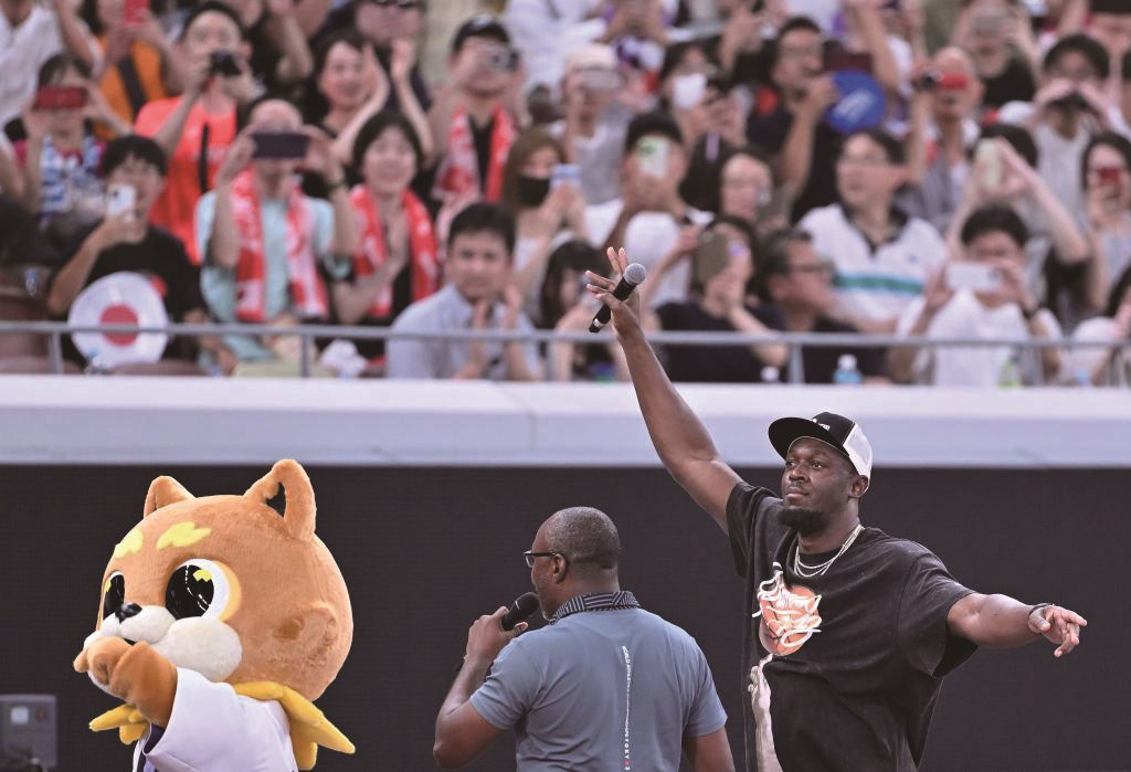 9月14日,牙买加短跑名将博尔特(右)现身日本东京国立竞技场。