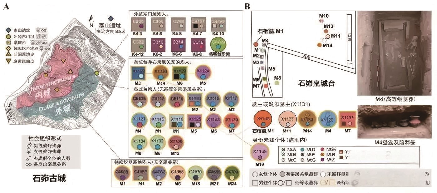 石峁遗址的父系主导社会结构方面,研究构建起横跨高达四代的家族谱系,主要建立者均为地位较高男性墓主,其配偶来自不同生物学家族;在目前检测的所有石峁文化遗址中,父系的Y染色体单倍型结构较为单一,而母系的线粒体单倍型高度多样;相关墓葬空间布局和家庭关系也支持潜在的父系为主导的居住体系。