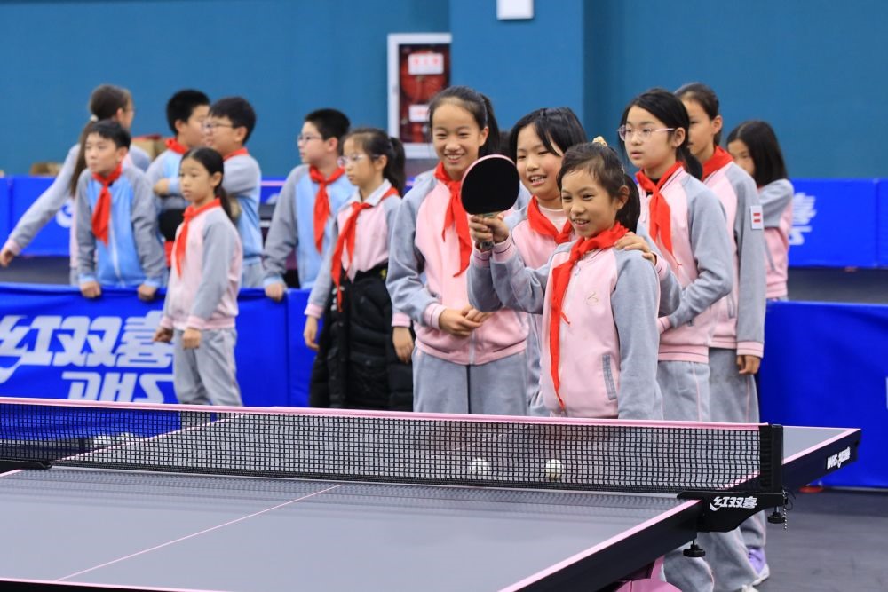 学生们体验乒乓球训练。