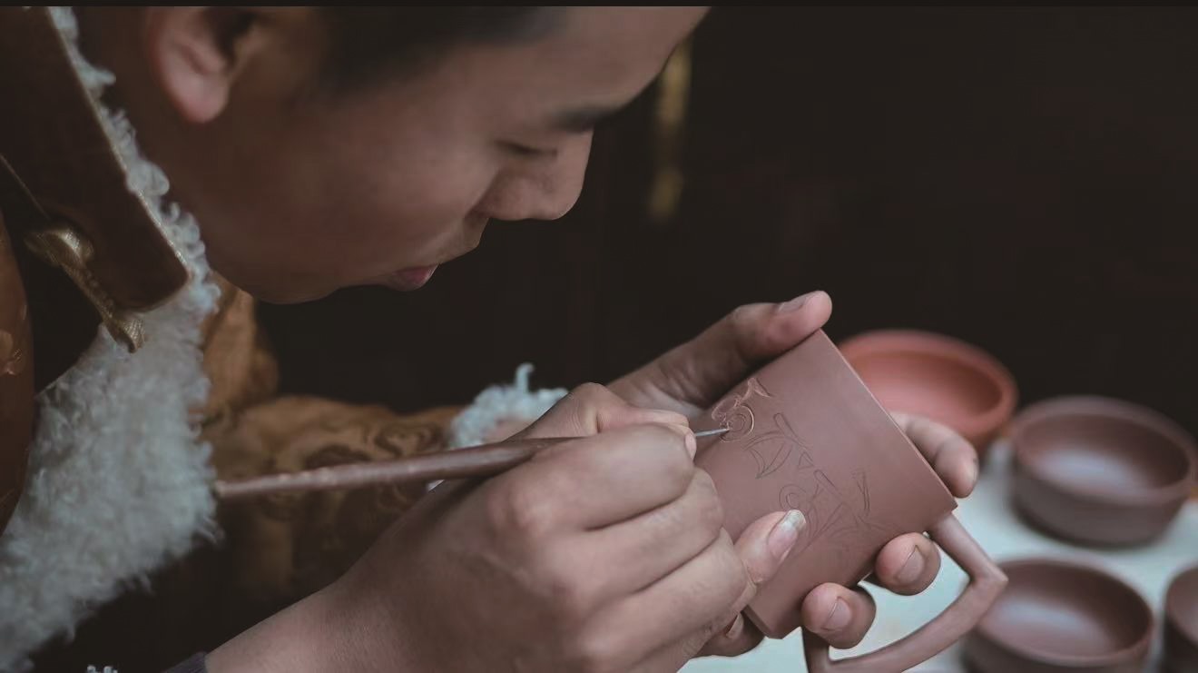 图为嘎玛仁青在自制的陶瓷杯上刻字。清晨的阳光透过工作室的玻璃窗,洒在嘎玛仁青沾满陶土的双手上。案头的半成品黑陶茶盏釉色沉