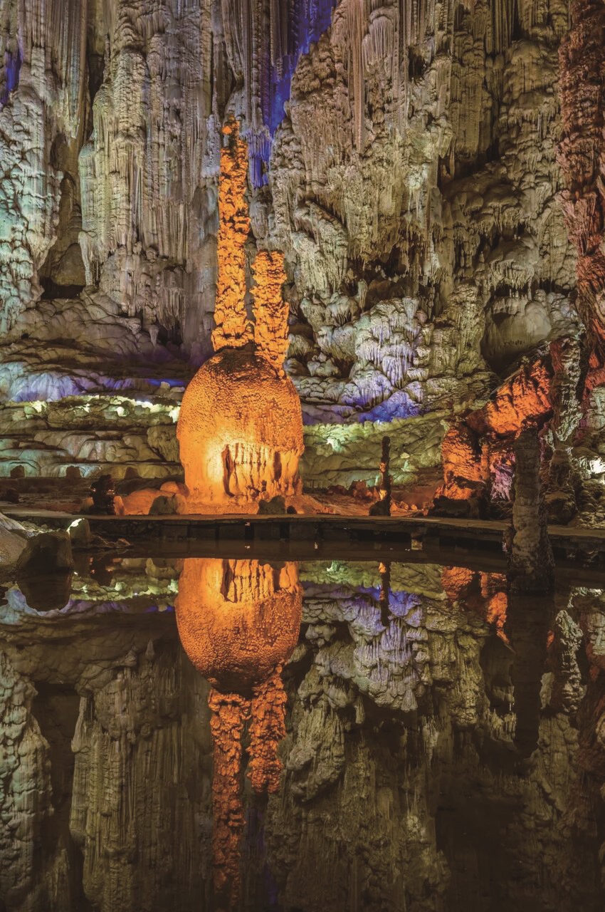 走进洞内,40米高的“银雨树”如通天塔般矗立,“霸王盔”石笋像一顶被时光凝固的王冠……乘小船穿过“十万大山”景区,石壁倒映水中,恍若平行世界。