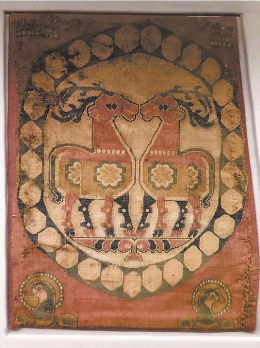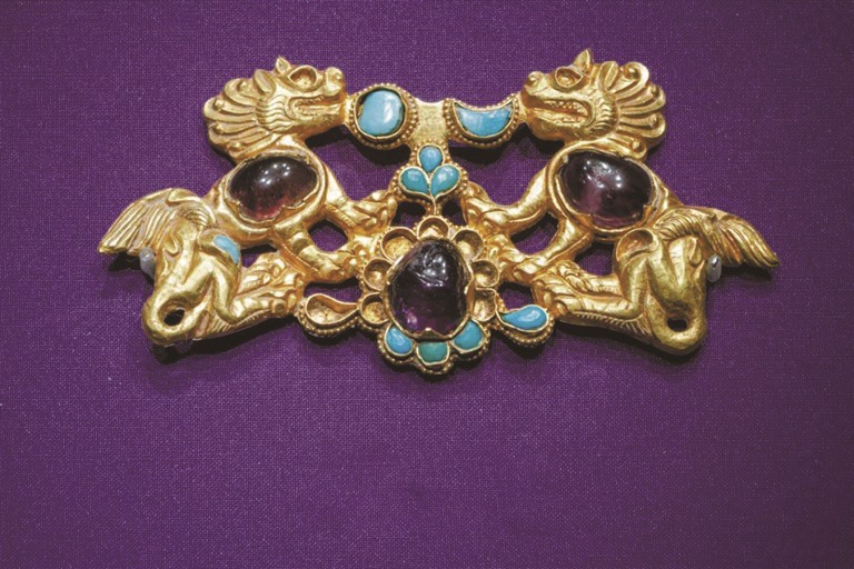 一方银印“外甥阿柴王之印”静静躺在展柜中。这枚银印出土于青海都兰热水墓群“2018血渭一号墓”,印面镌刻着古藏文与骆驼图案,印证了文献所载的吐谷浑与吐蕃之间的甥舅联姻——墓主人正是接受吐蕃统治的吐谷浑王。小小印章,记录下高原丝路上族群互动的图景。而都兰的意义远不止于此。作为丝绸之路“青海道”(吐谷浑道)的关键节点,这里见证了东西文明的交流互鉴。展览中,双狮日月金牌饰上的雄健狮纹,隐约可见萨珊波斯的风格;镂空方形大角鹿金牌饰的神秘造型,则带有中亚粟特艺术特色;其间更有织造精美、来自中原的丝绸。在这条雪域之路上,不同文明的审美与技艺碰撞交融,共同积淀为青藏高原瑰丽的文化风貌。